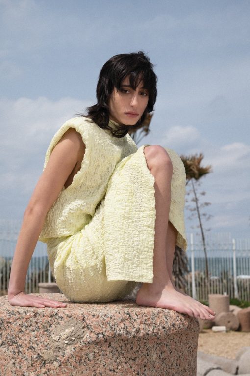 Crinkled knit high neck sleeveless top with shoulder pads and back invisible zipper.