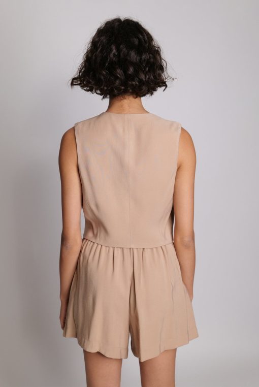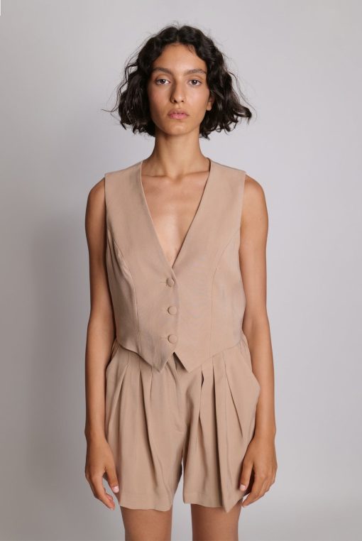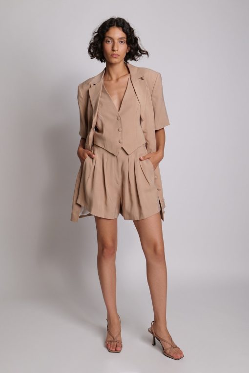 Diagonal viscose high-waist pleated shorts with side pockets. Featuring an elastic waist with gathering details. Front zip fly and covered buttons.