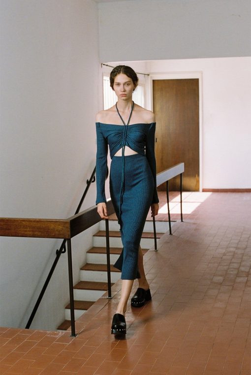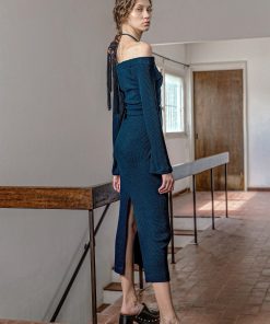 Lurex rib knit halter neck top with an open back, and flared sleeves.