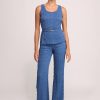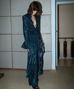 Pleated knit with foil high-waist straight leg pants, elastic waist at back, and invisible back zipper fastening.