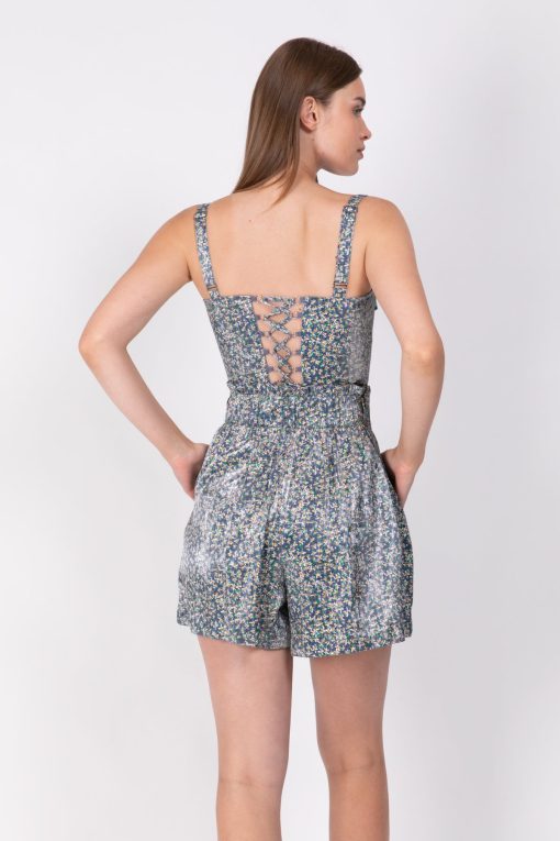 Shiny printed viscose high waisted short pants with front pleats and side pockets.