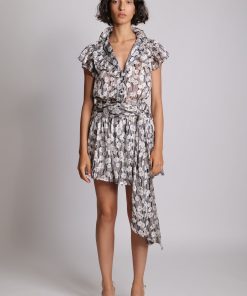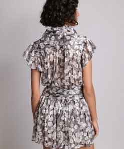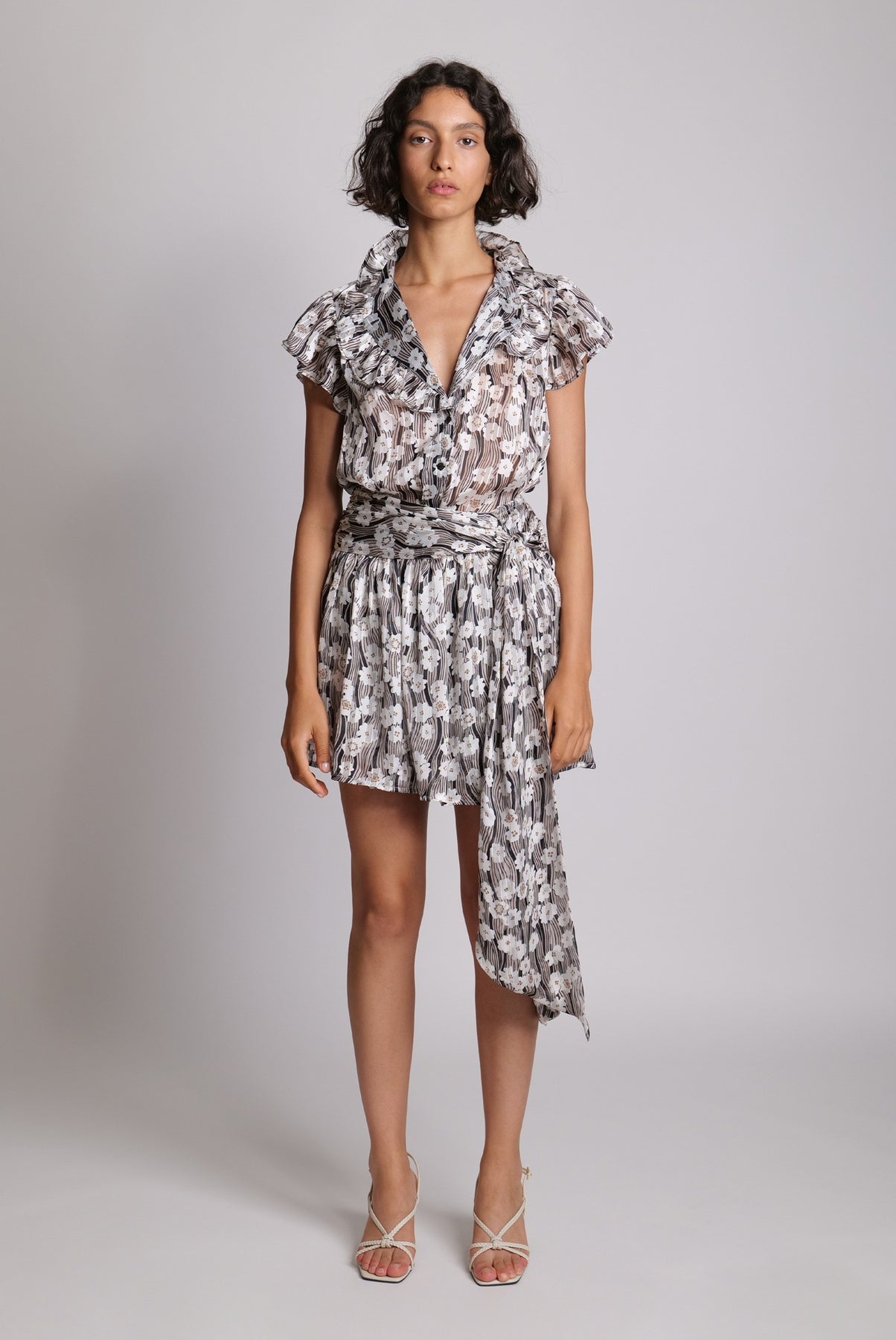 Printed chiffon High waist flared mini skirt with gathering waist belt tie detail.