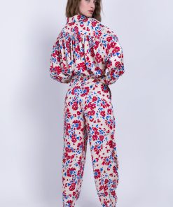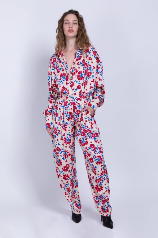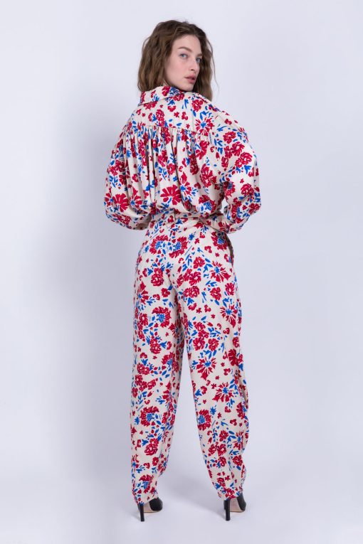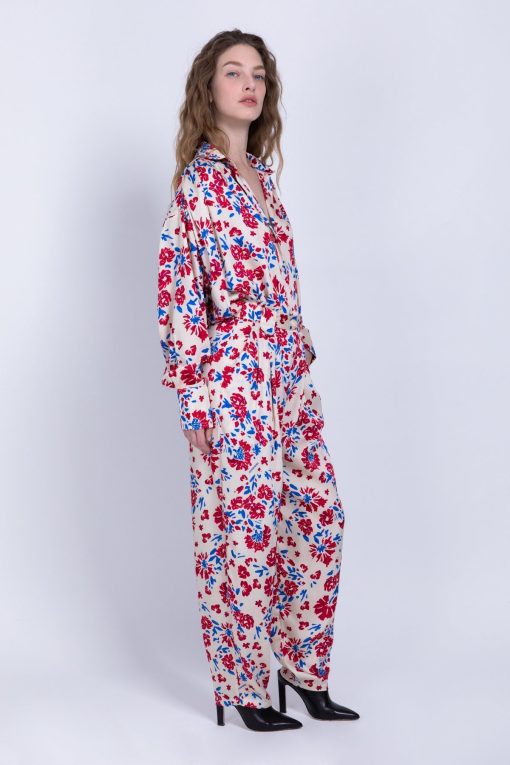 Floral printed satin high waist cut pants with sidepockets, front pleats. Closure in the front with azipper and top button.