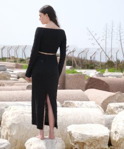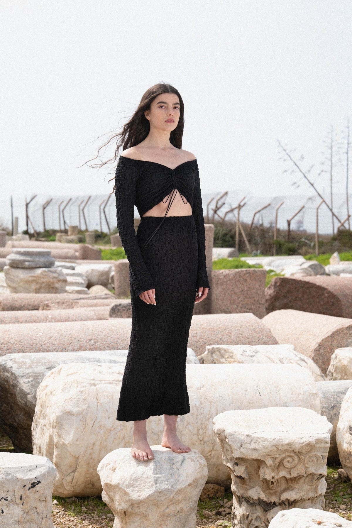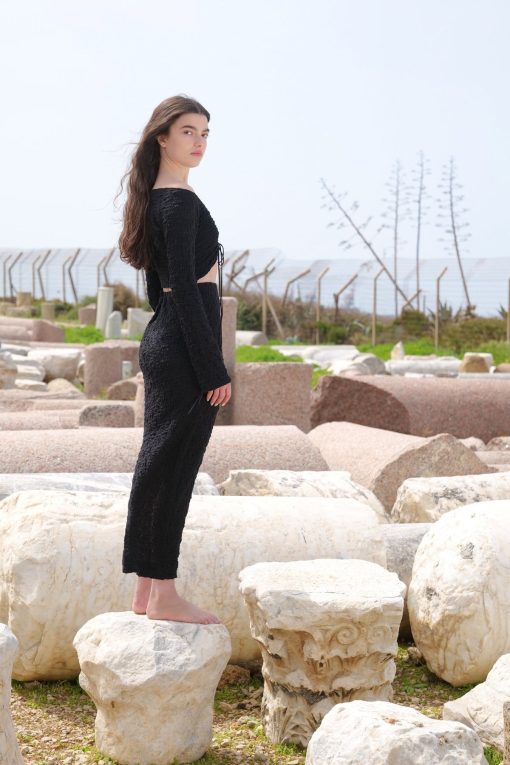 Crinkled knit ruched drawstring fitted crop top with off-the-shoulder long sleeve.