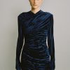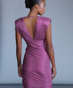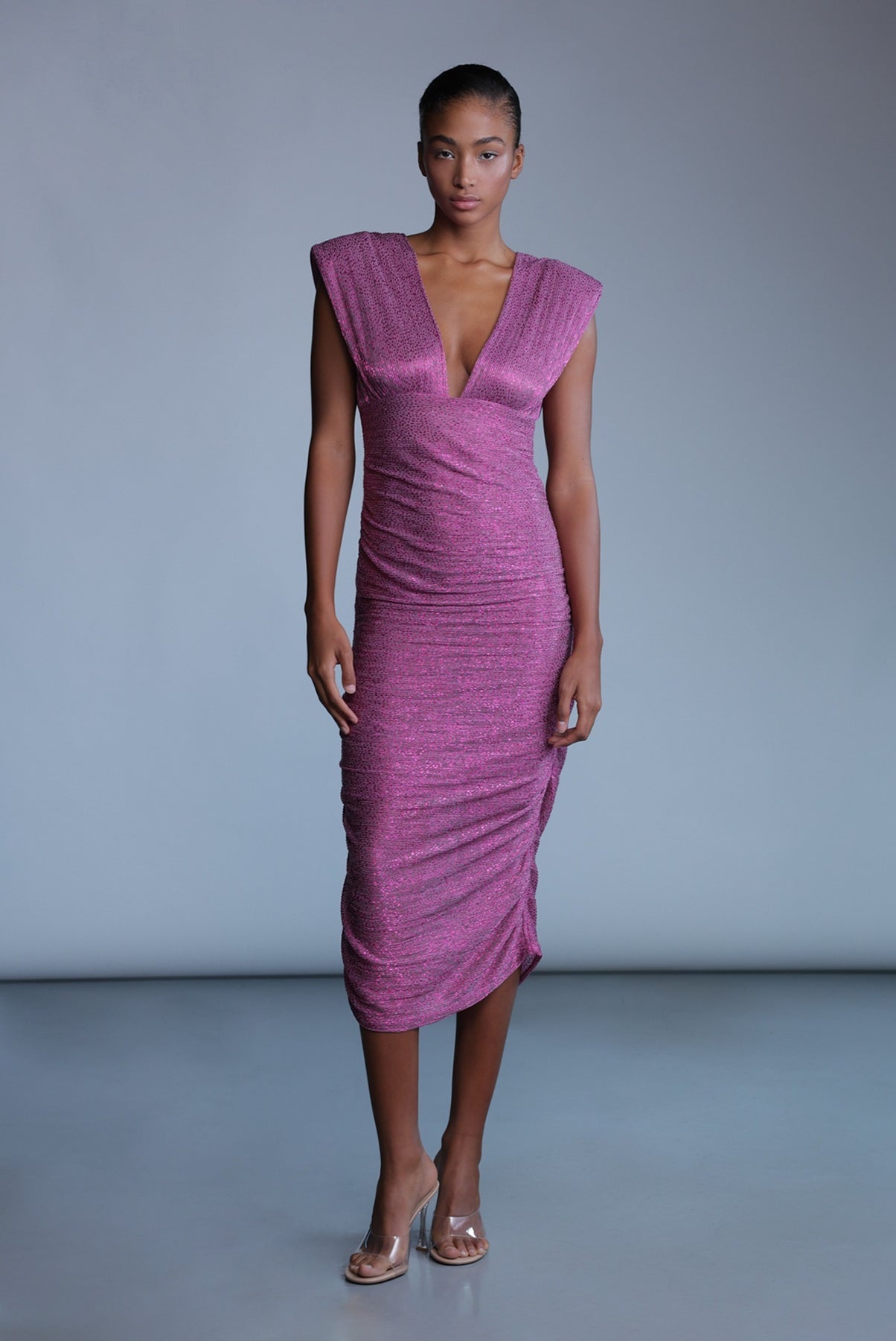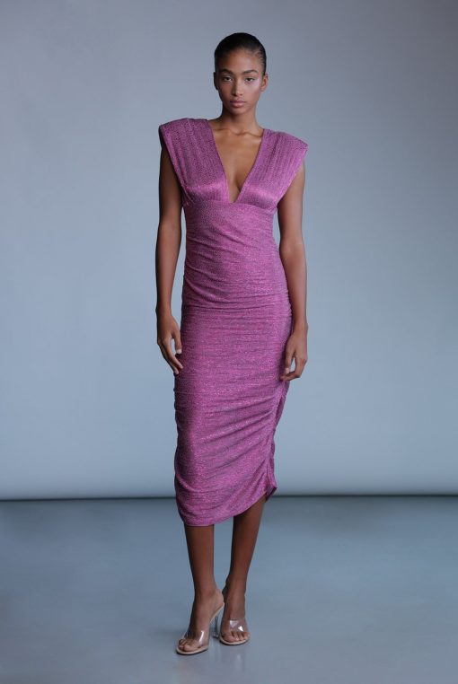 Ray lurex with foil midi dress featuring a deep V-neckline, shoulder pads with gathering details, and invisible zipper at the side.