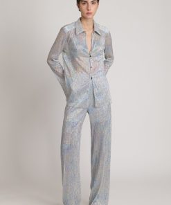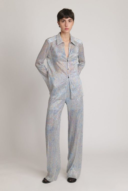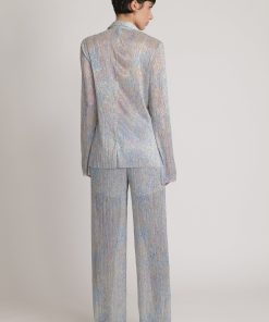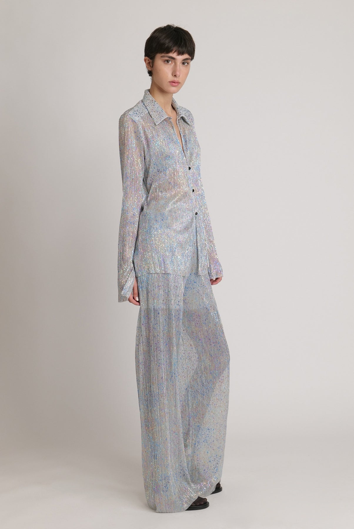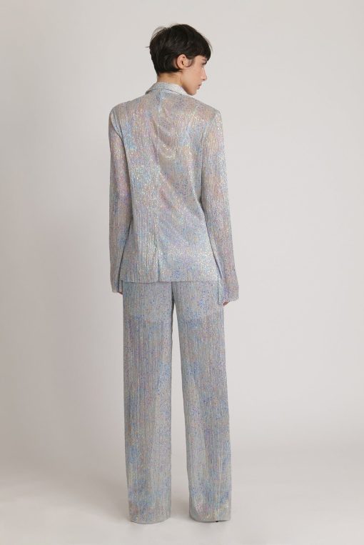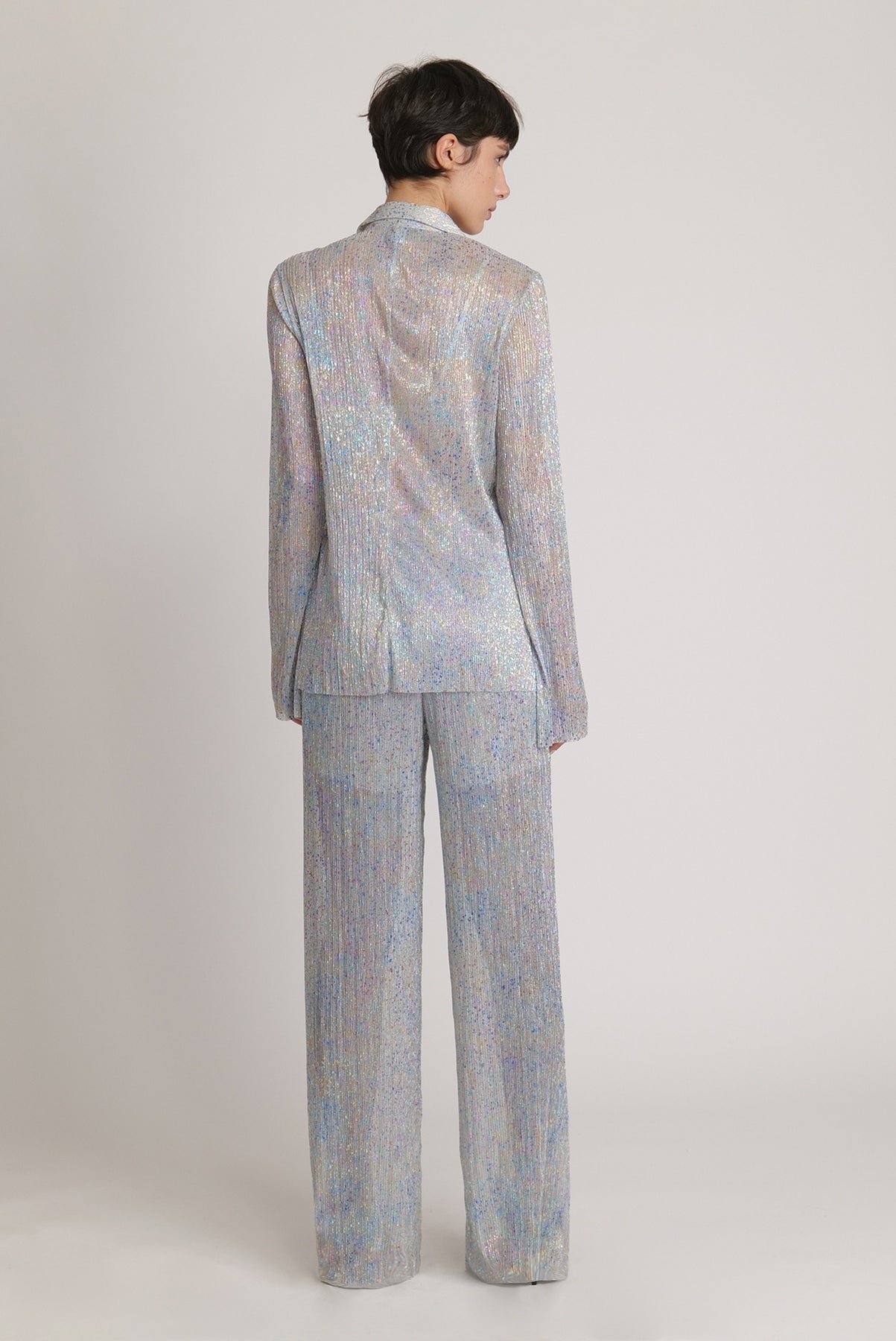 Pleated knit with multi dot foil high-waisted wide leg pants, with adjustable elastic waistband, and a hidden zipper at the back.
