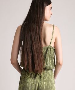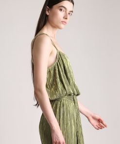 Pleated knit with foil top with adjustable straps, and ruched gathering at the waist.