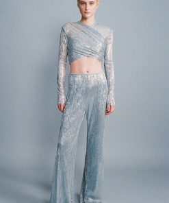 Ray lurex crop top with wrap gathered detail on the front, and long sleeves.