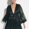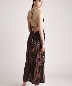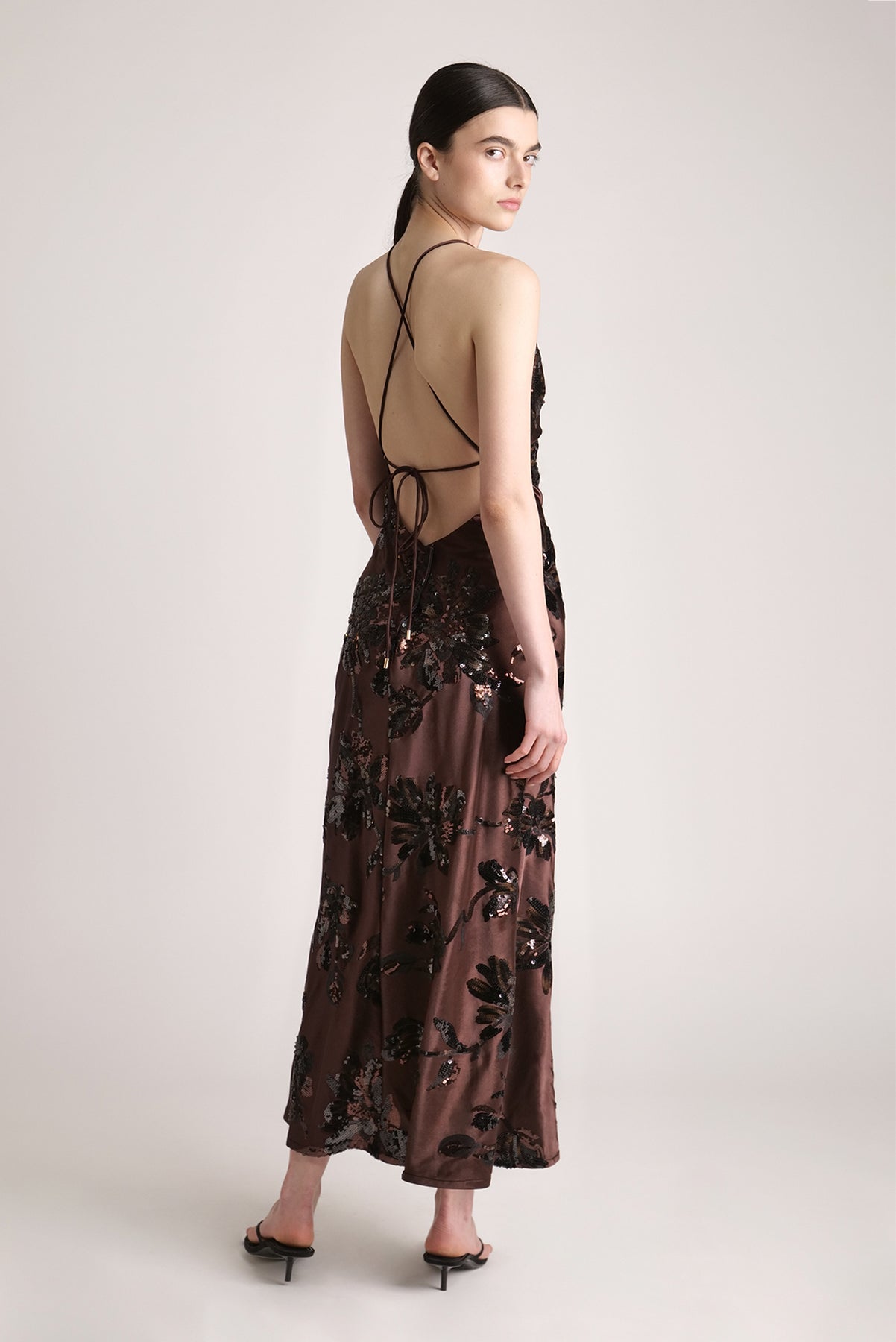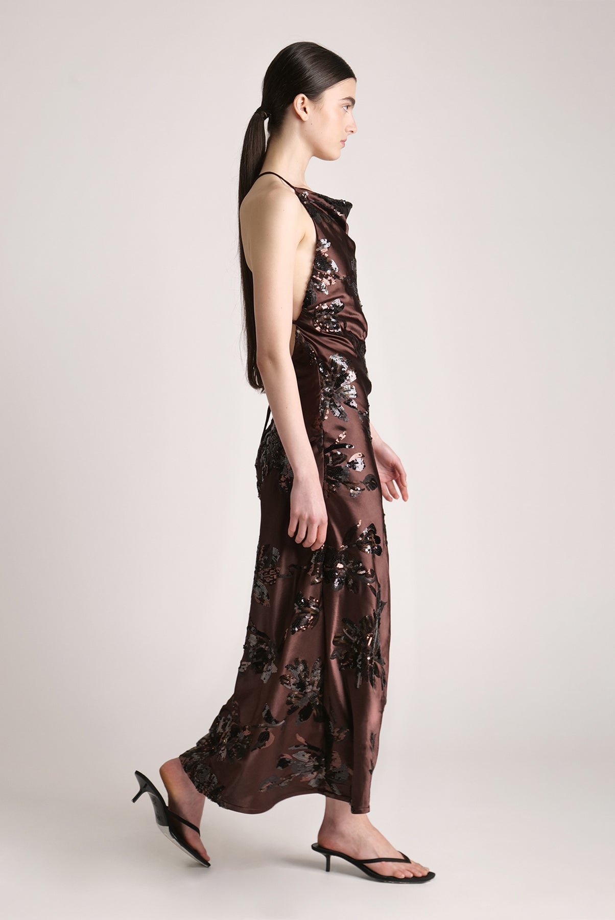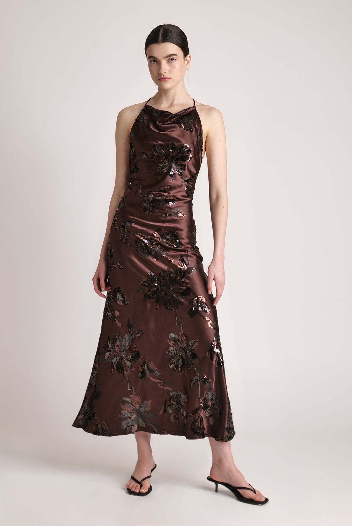 Blossom sequins on satin midi dress with a cowl neckline, and adjustable thin straps that cross at the back with a tie.