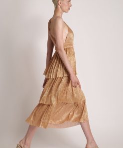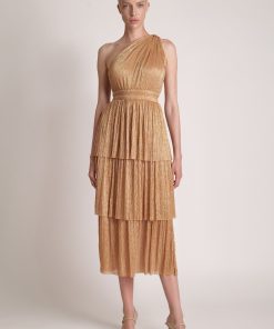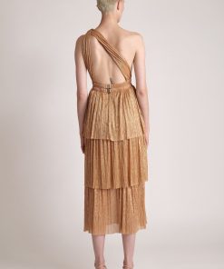 Ray lurex with sprinkled foil one shoulder layered midi dress, elastic waist, invisible zipper at the back, and two buckles.