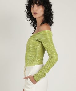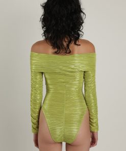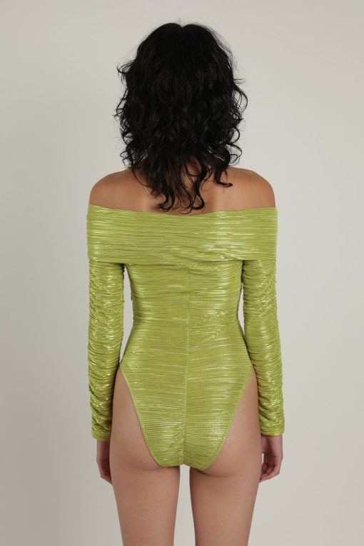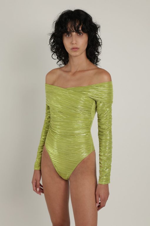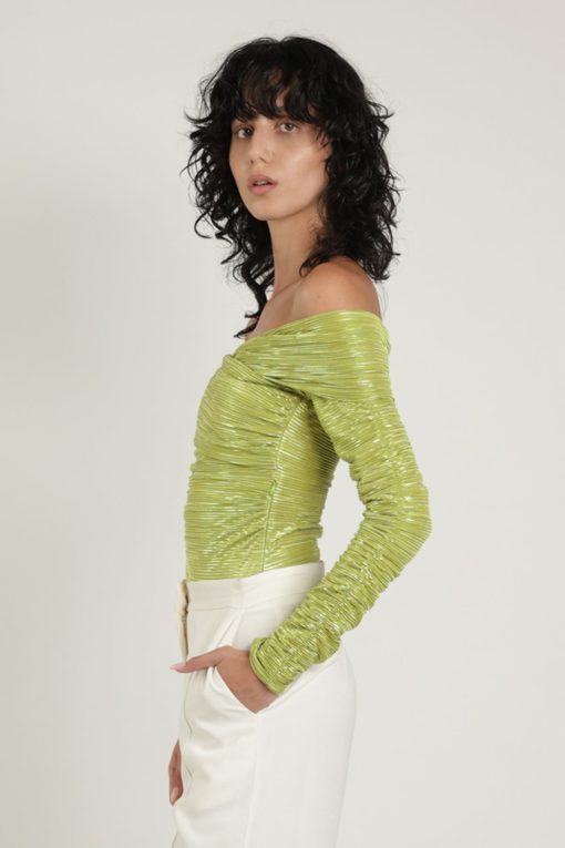 Pleated knit with foil off-the-shoulder bodysuit featuring twisted front detail, and long sleeves.
