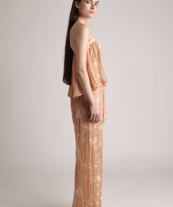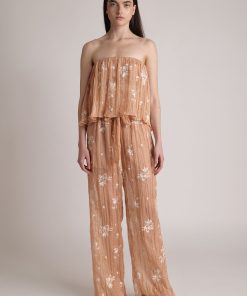 Pleated chiffon with embroidery wide leg pants with adjustable elastic waistband.