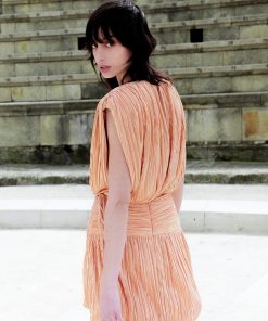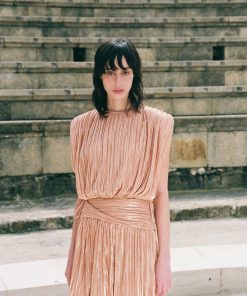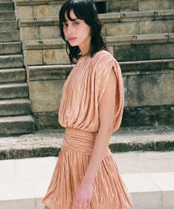 Pleated knit high-waist mini skirt featuring gathering and a unique twist detail on the waistline. Invisible back zip fastening.
