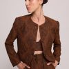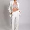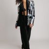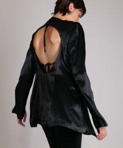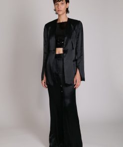 Lapel-less satin blazer with long sleeves and shoulder pads. Featuring front jetted pockets, design side vents with satin covered buttons, and button fastening at the front.