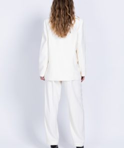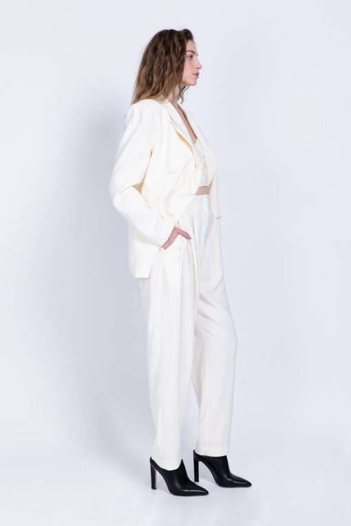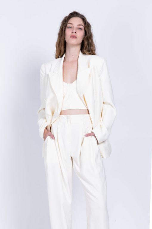 Woven viscose double-breasted blazer with longsleeves, lapel collar, and shoulder pads. Front flappockets and fabric covered buttons placket on thefront and a hidden button.