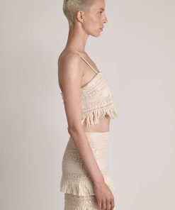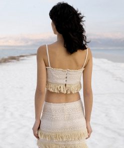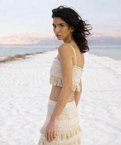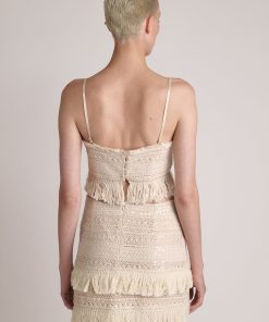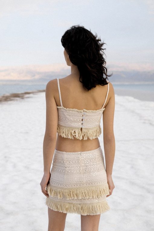 Sequined crochet mini skirt featuring a trim fringe, and invisible back zipper fastening.