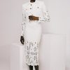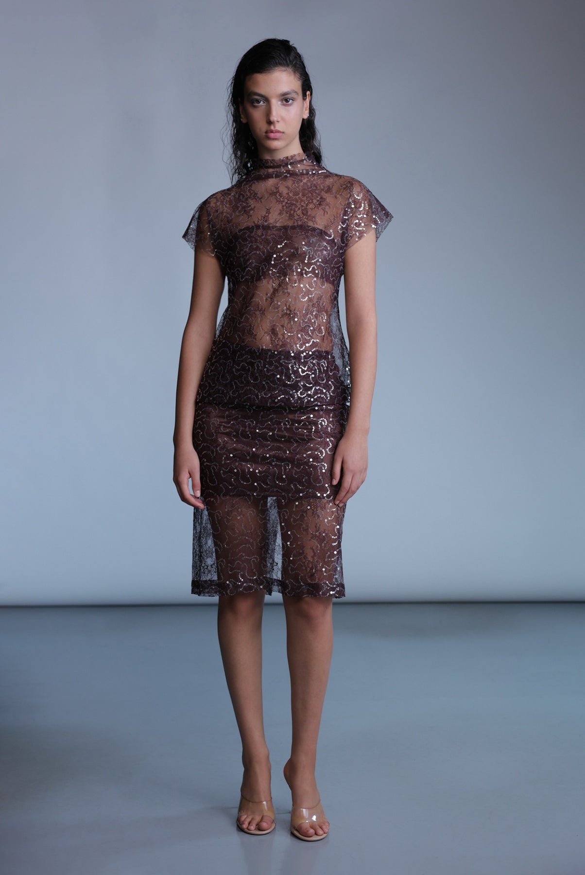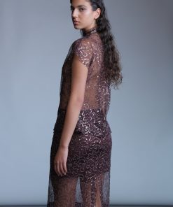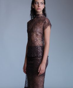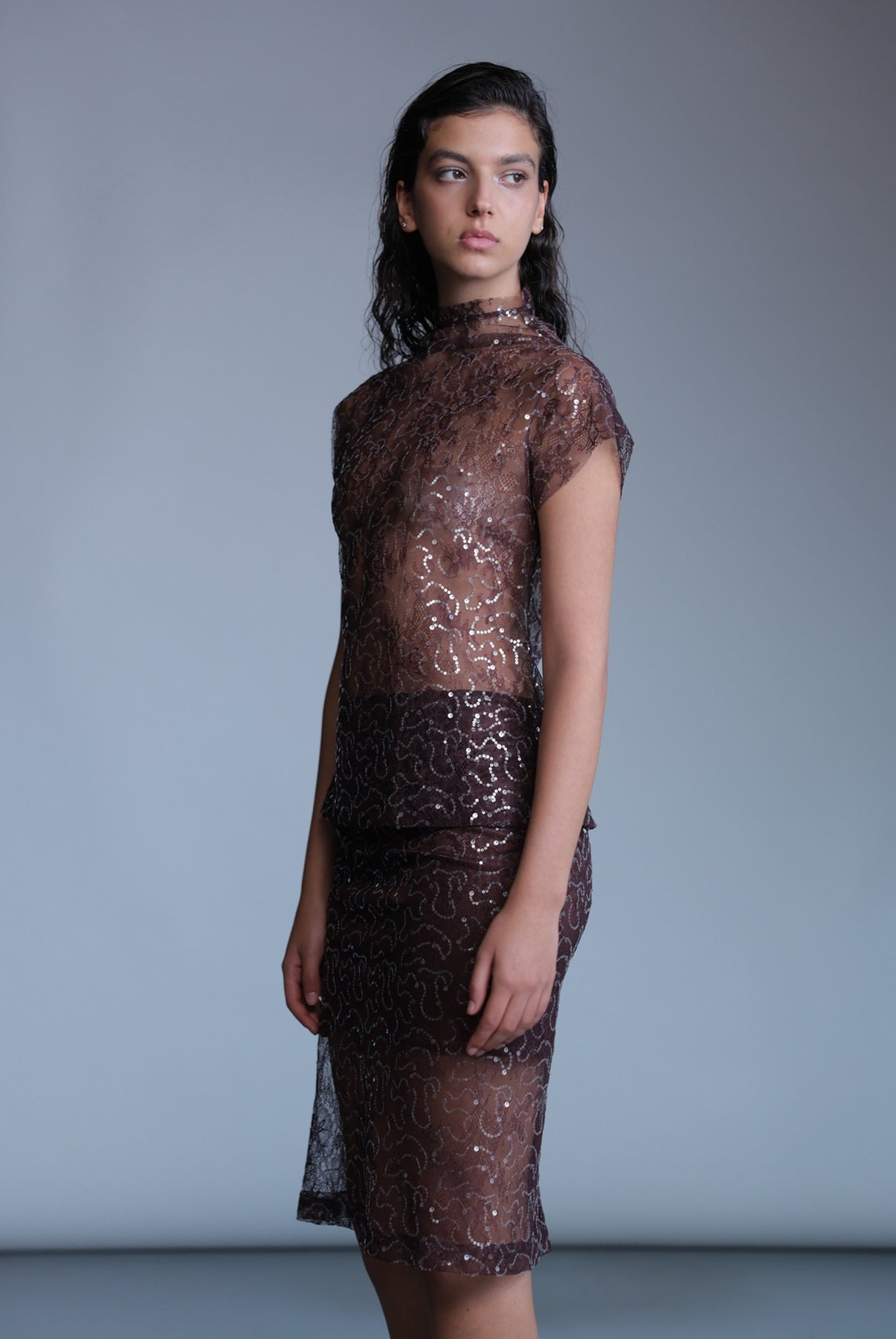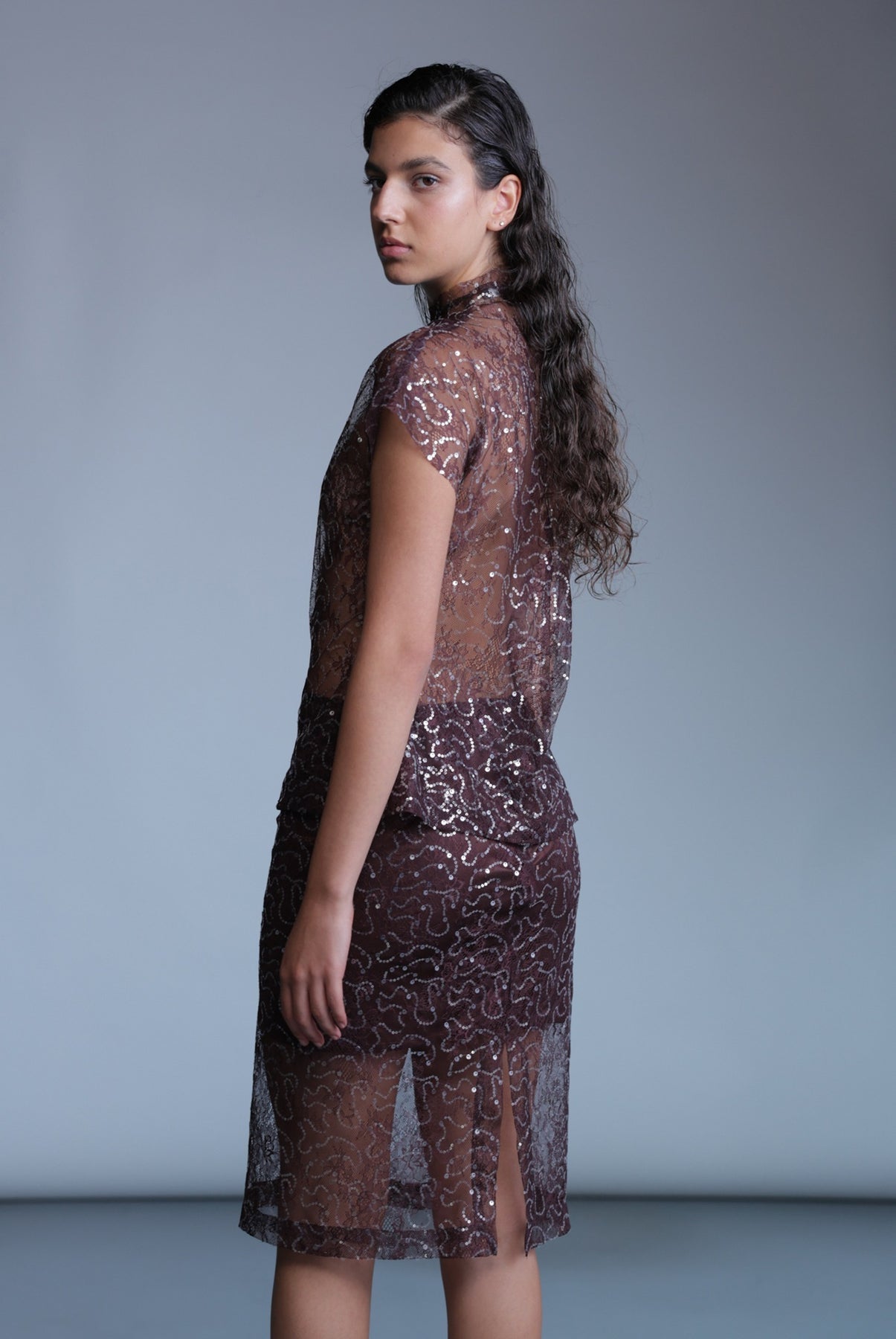 Sequined lace high waist skirt with invisible zipper at the back, and a slit at the hem.