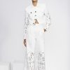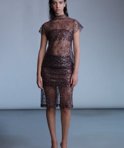 Sequined lace high waist skirt with invisible zipper at the back, and a slit at the hem.