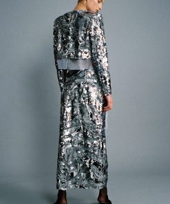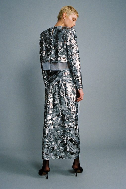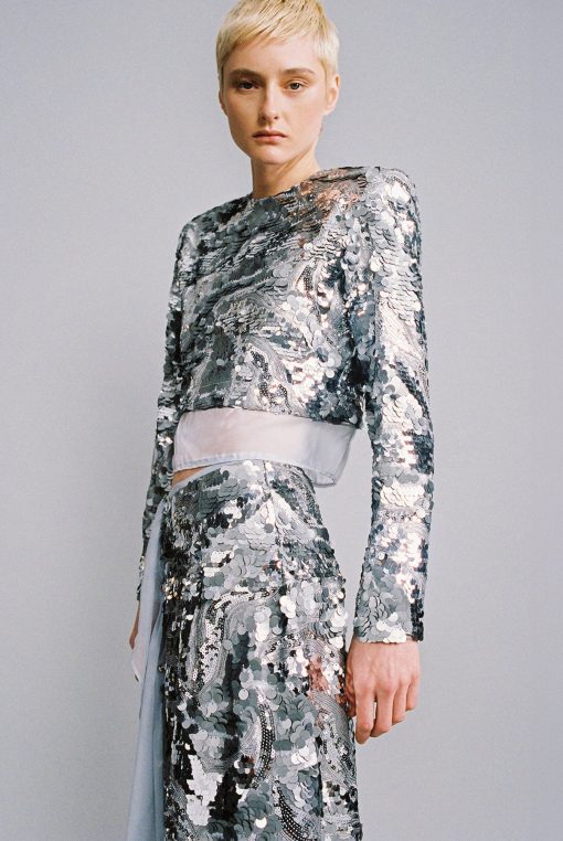 Gradient sequins on chiffon crop top with long sleeves, and open back.
