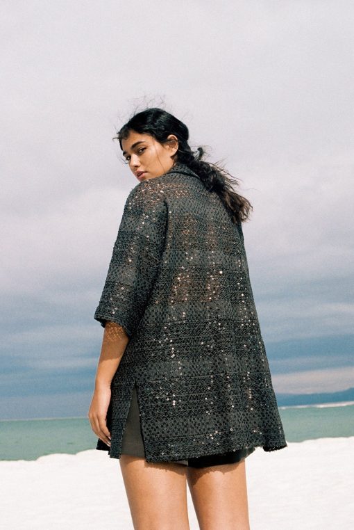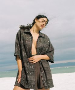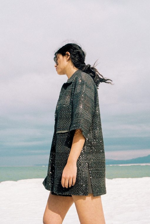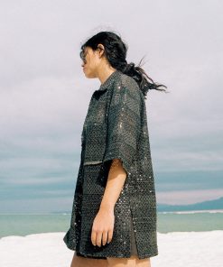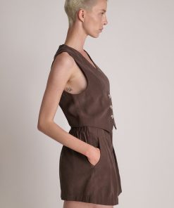 Diagonal viscose blend high-waist pleated shorts with side pockets featuring an elastic waist with gathering details, and front zipper with covered buttons.
