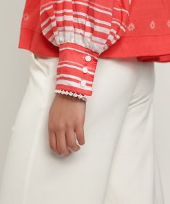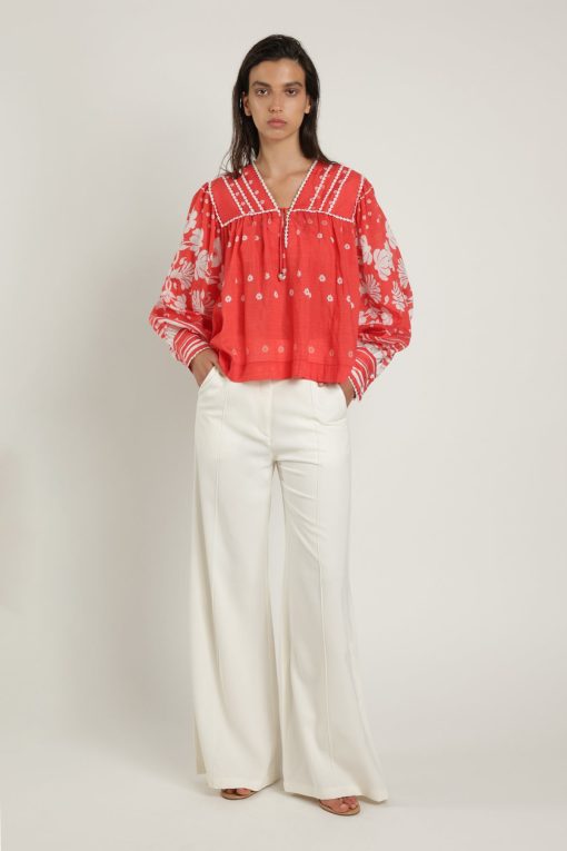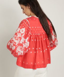 Floral bandana print top with puffed sleeves with cuffs. Opening at front with ties.