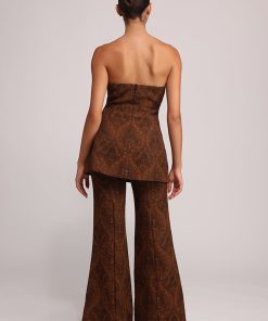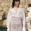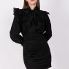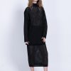 Stripe sequins on velvet pencil skirt with gathering details, front slit, and invisible zipper at the back.