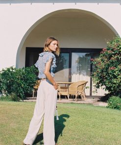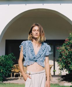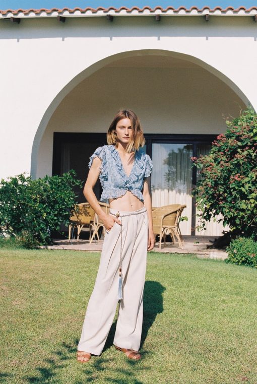 Folk pleated chiffon V- neckline top with ruffle featuring tie belt fastening on the waist, and ruffle sleeves.
