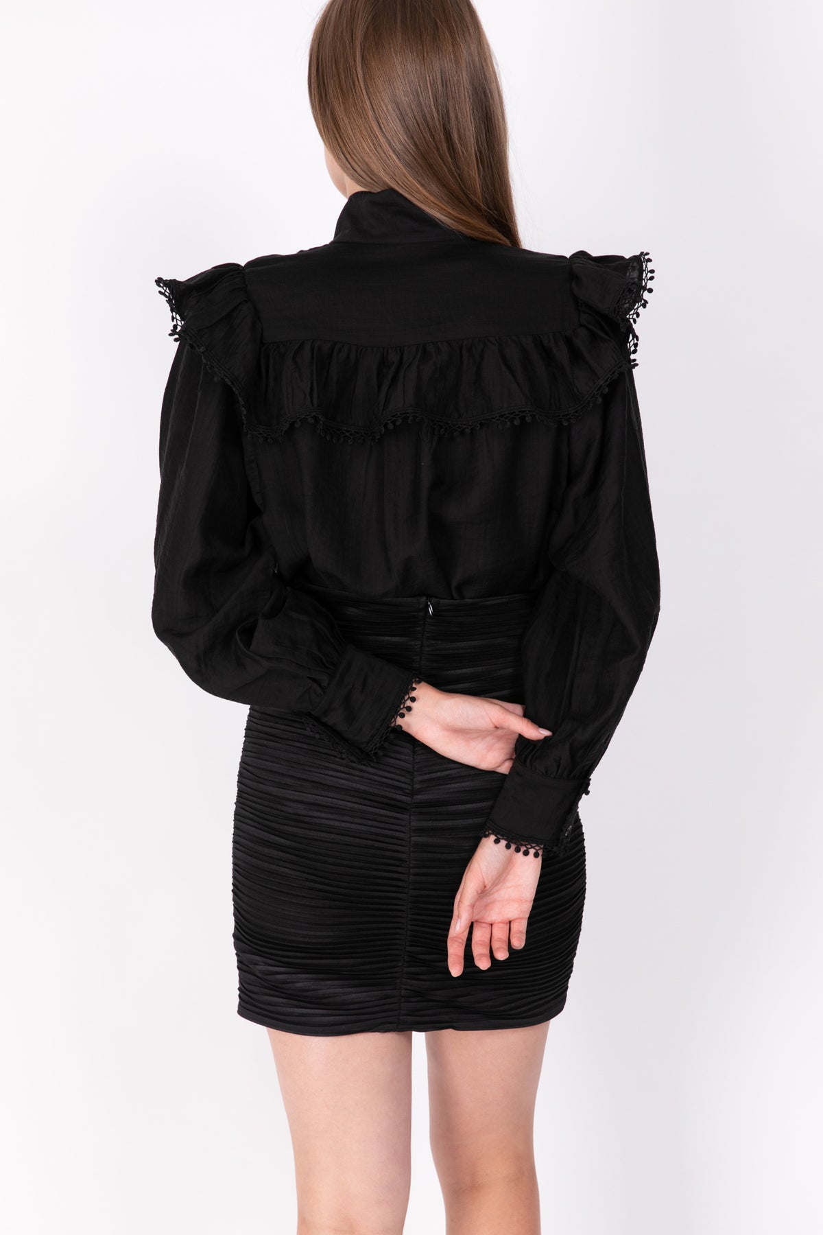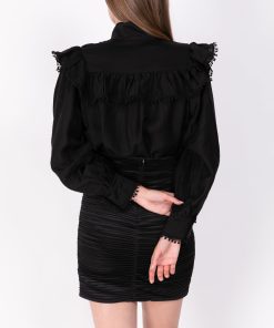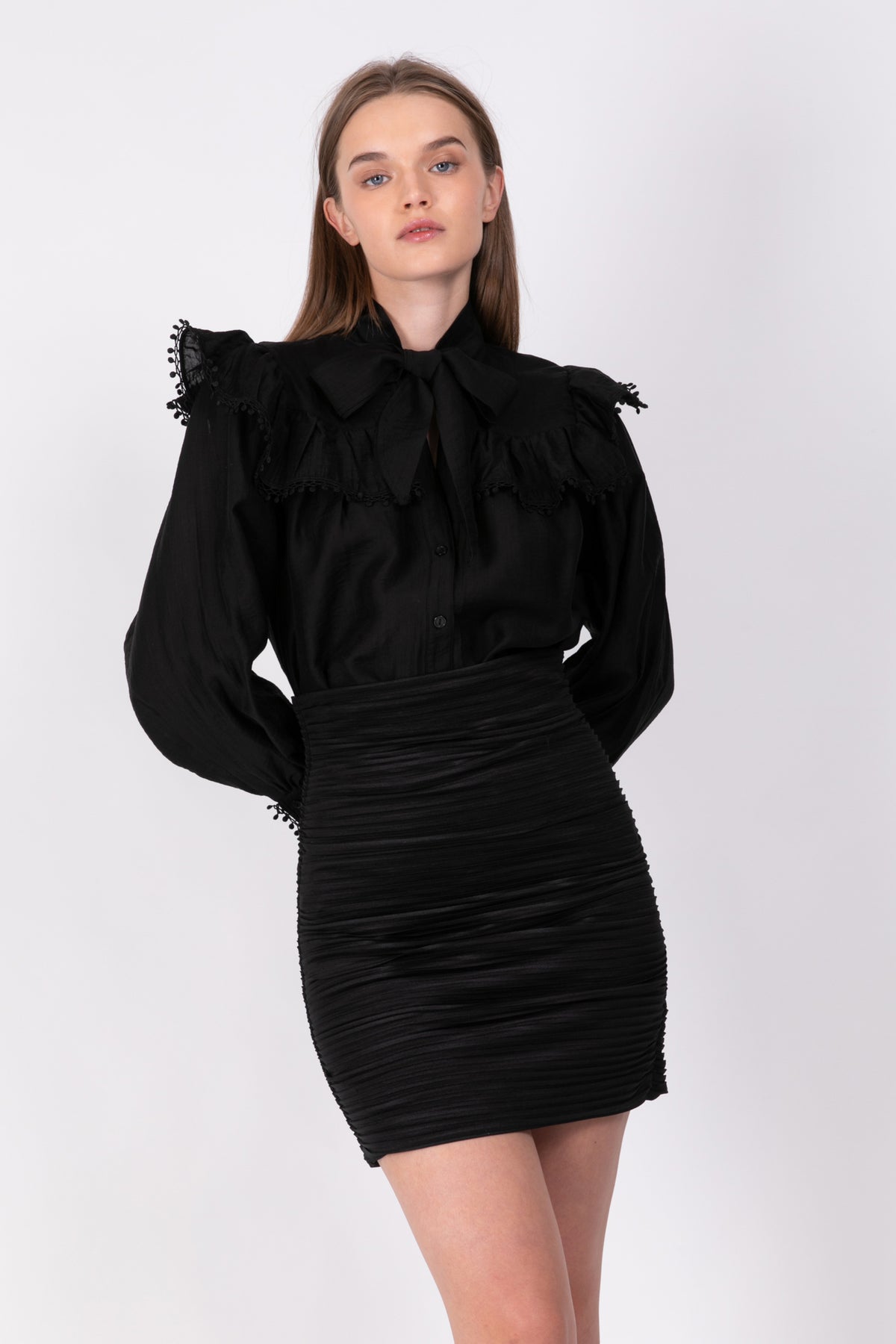 DescriptionPleated knit high waist fitted mini skirt with gathering details.