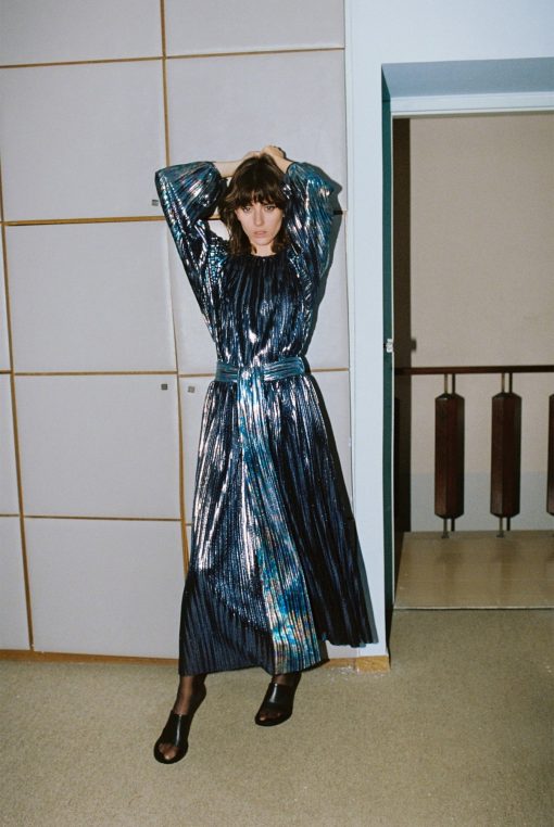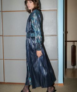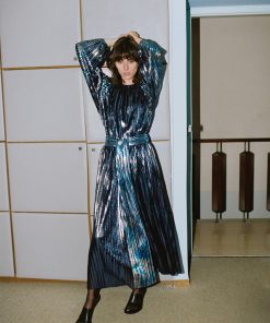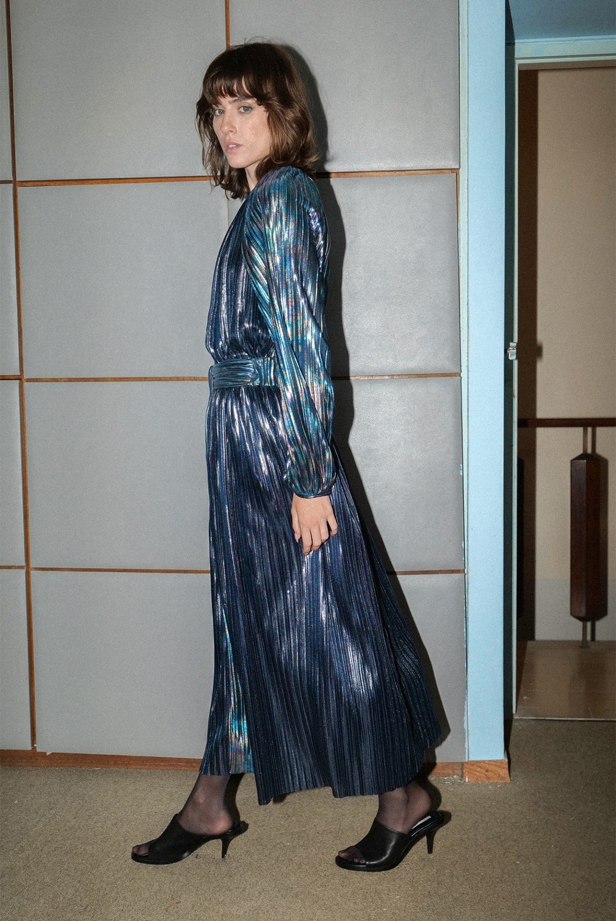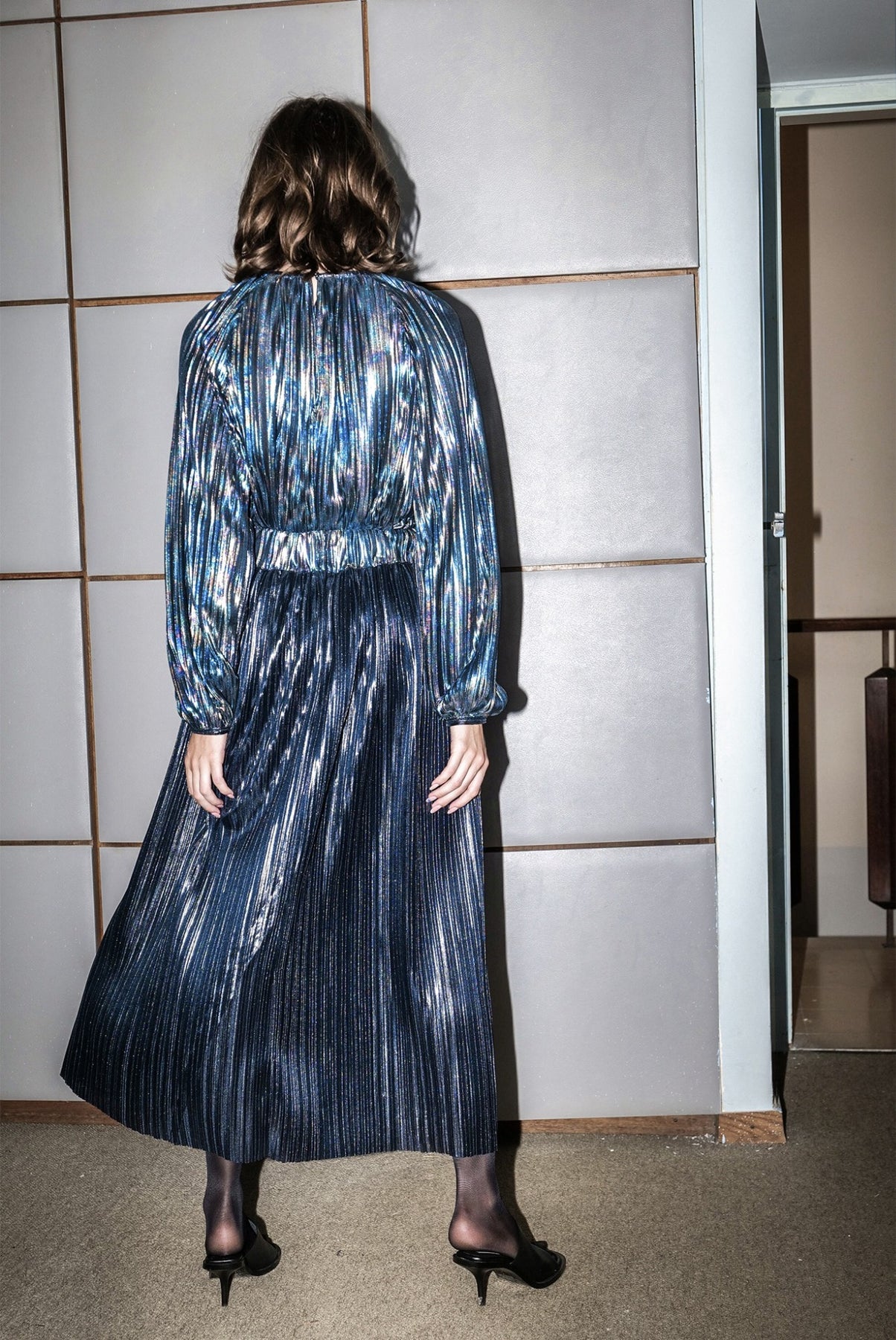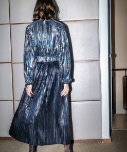 Two-tone pleated knit with foil midi skirt with high waist and gathering details.