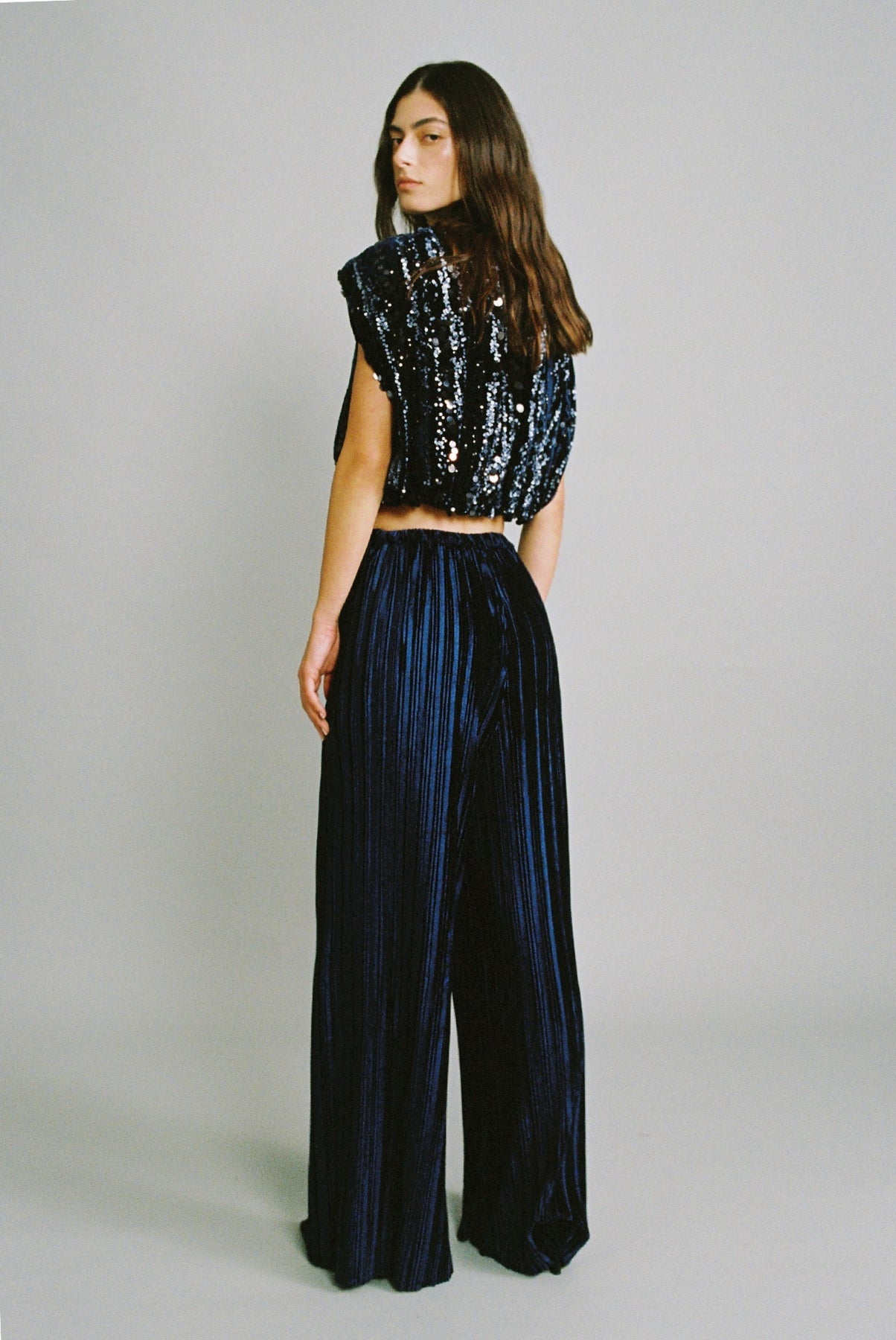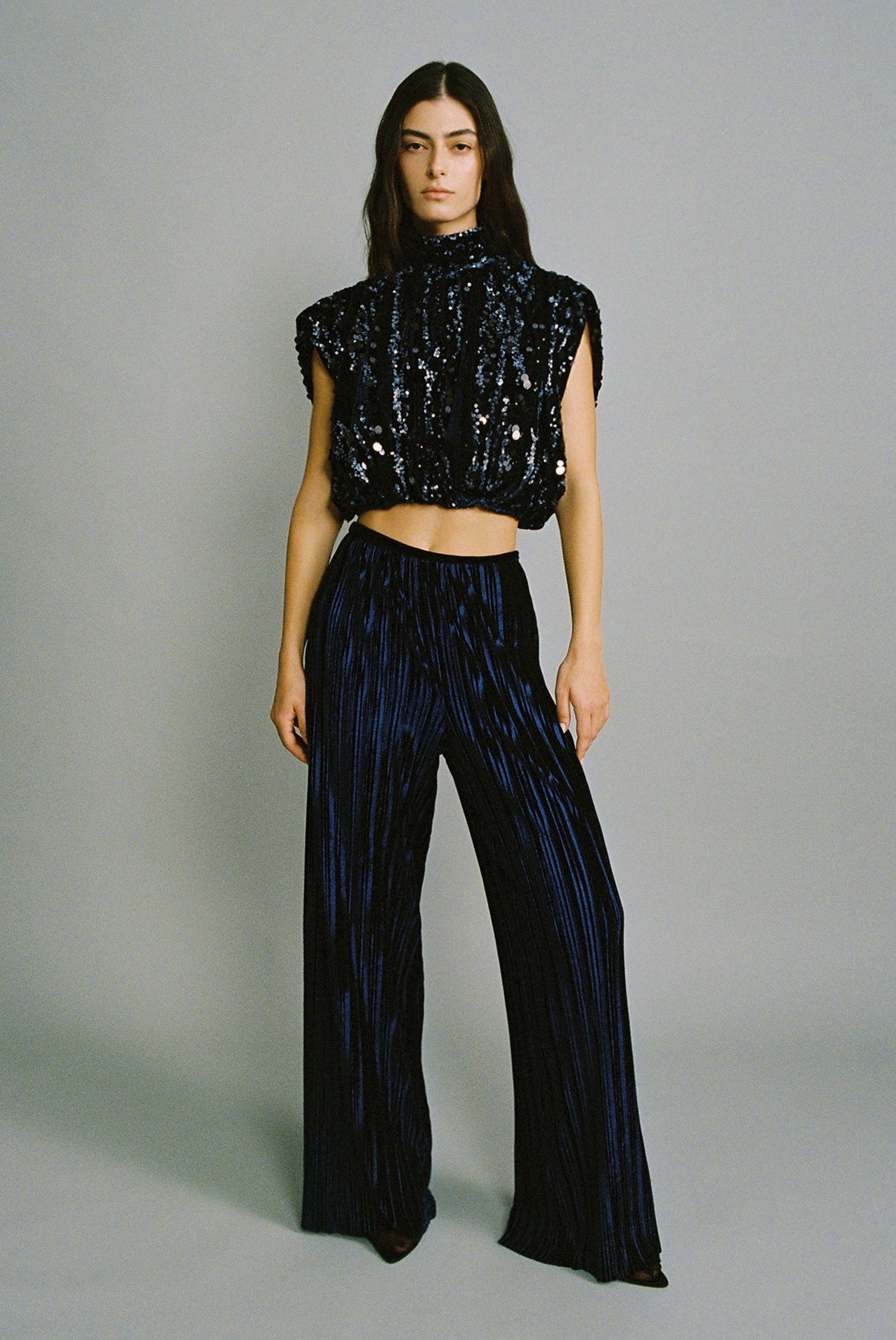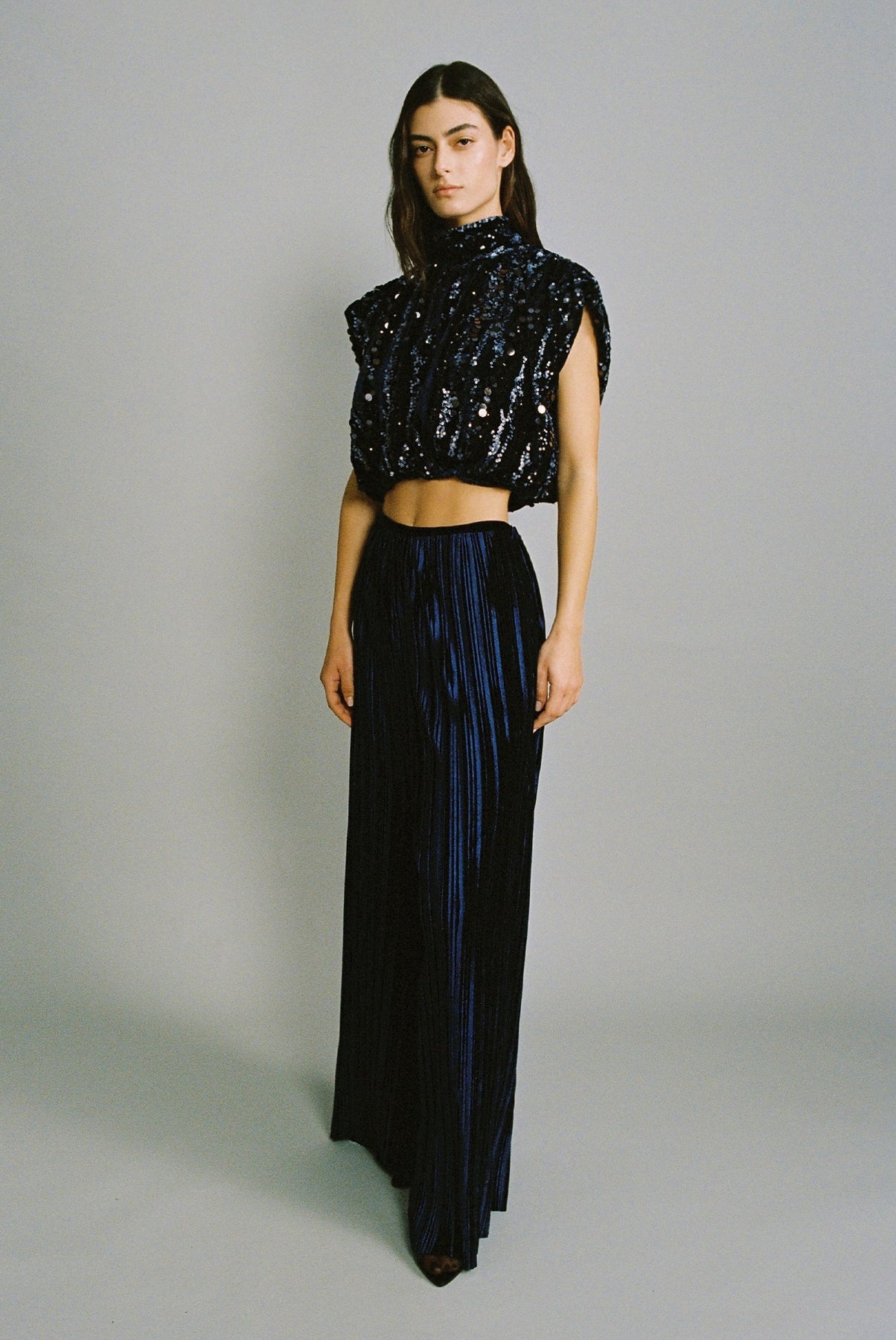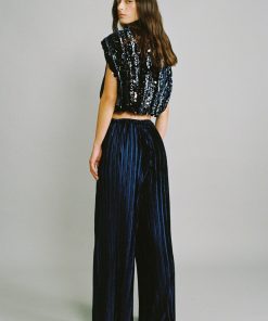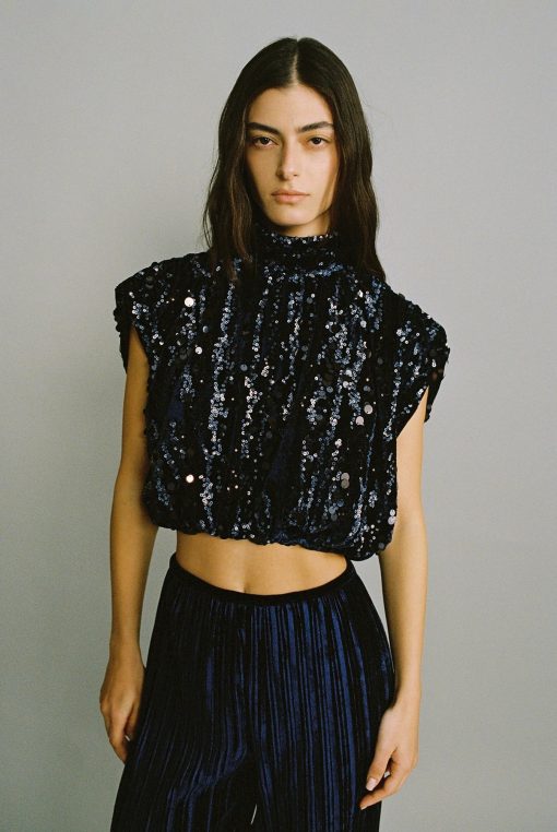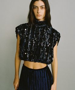 Stripe sequins on velvet crop top with shoulder pads.