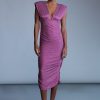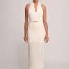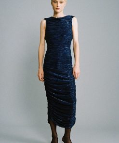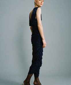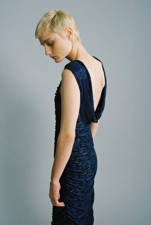 Pleated knit with foil midi dress featuring a deep opening at the back, and side draped detail.