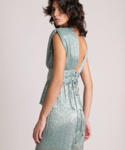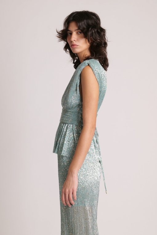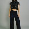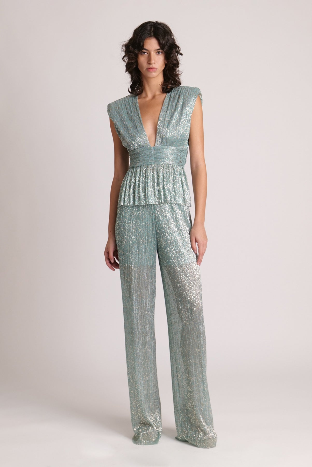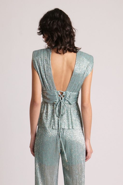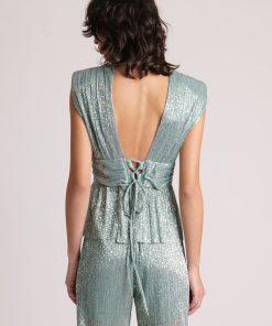 Pleated knit with multi dot foil deep V-neckline top, padded shoulders, open back with adjustable strap, and lacing fastened with a metallic button.