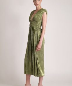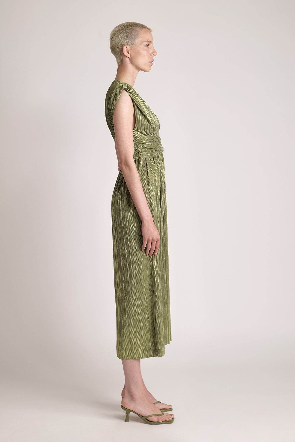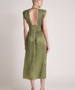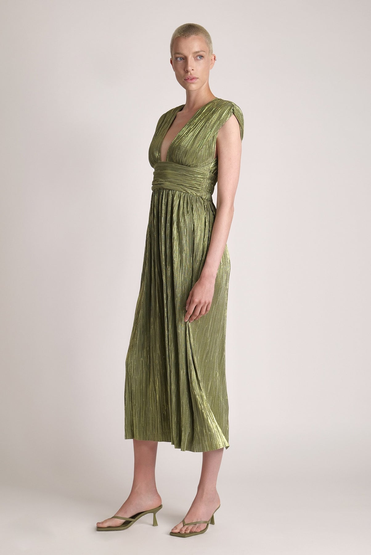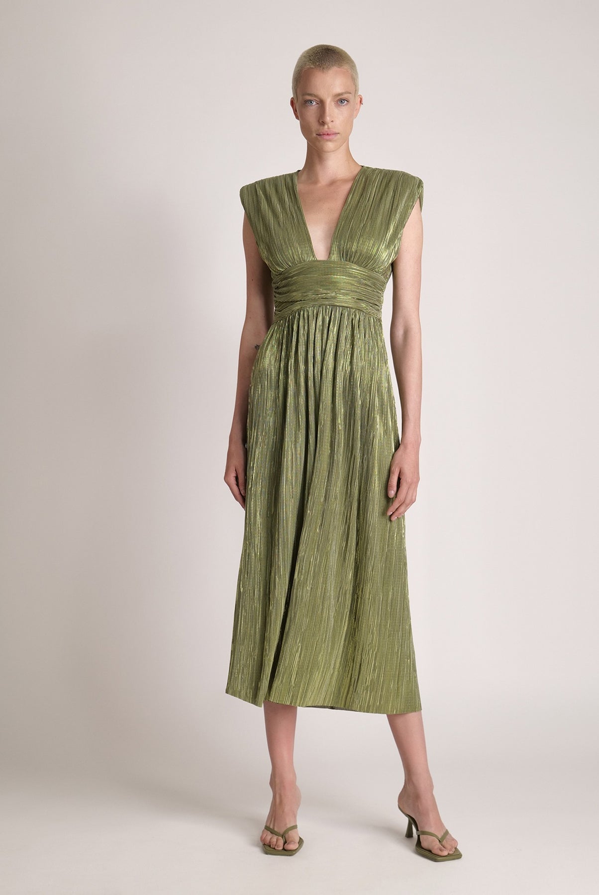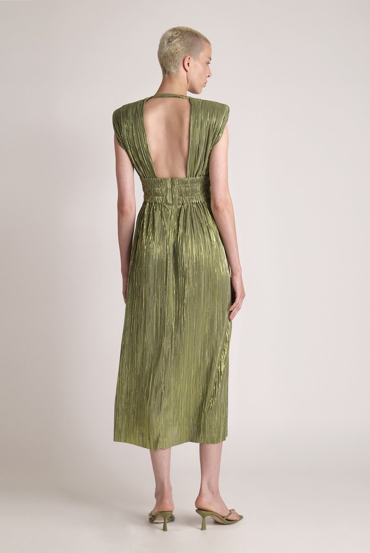 Pleated knit with foil midi dress featuring a deep V-neckline, shoulder pads with gathering details, and deep open back with invisible zipper.
