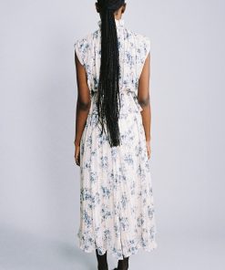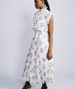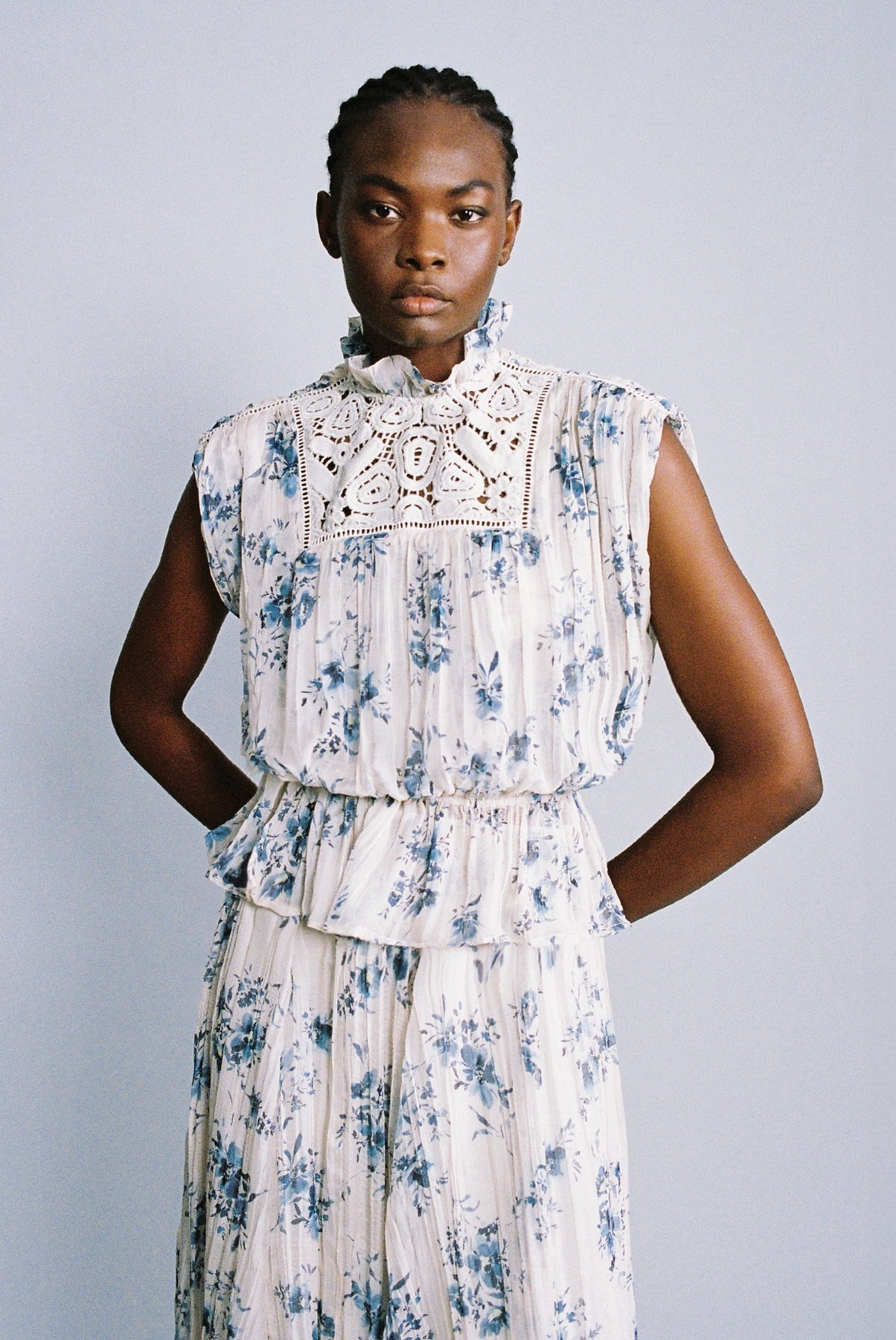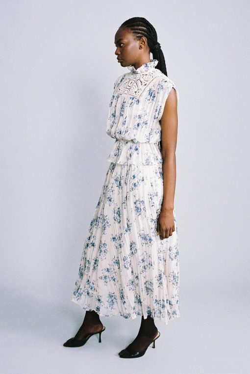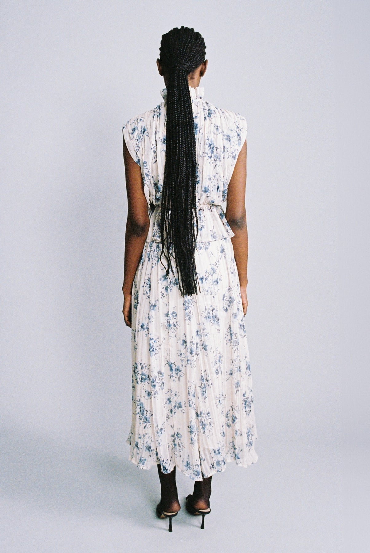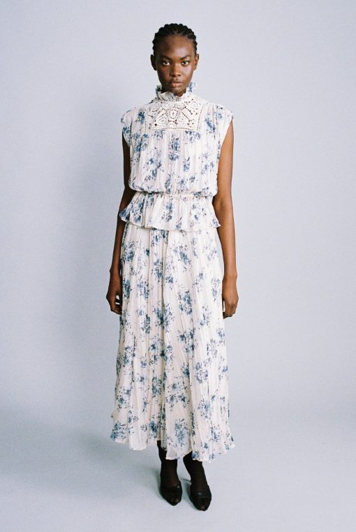 Floral print on crinkled chiffon high neck top featuring a ruffle trim, and elastic at the waist.